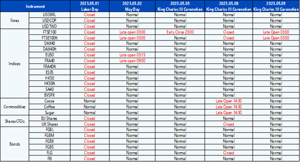 Please be advised that the following instruments’ trading hours and market session times will be affected by the upcoming May holidays.