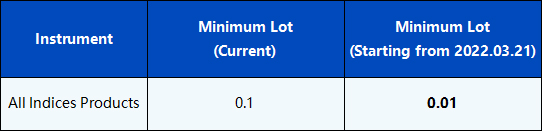 We are pleased to announce that the minimum lot of opening order will be optimised on all Indices CFDs products starting from 21th March 2022 to further enhance the competitiveness and improve the trading environment.