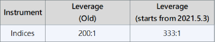To further optimize the competitiveness and improve the trading environment, please be advised that the leverage on all index products will be adjusted from 200:1 to 333:1 starts from 3rd May 2021.