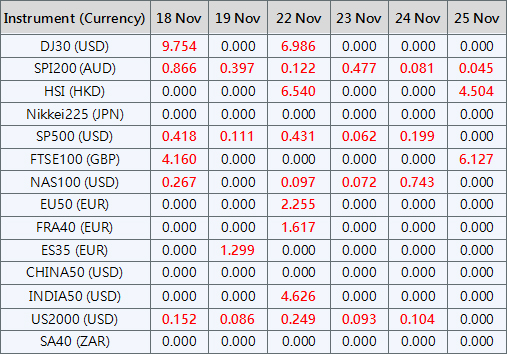 Please be advised that the dividends of the following index CFDs will be adjusted by upcoming ex-dividend dates. The comment for trading index CFDs will be in the following format “Div&<Product Name>&<Net Volume>” which show in the balance after the close of the day before the dividend payment date.