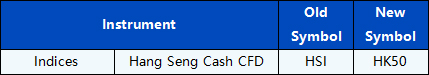 Clients who have open Hang Seng Cash CFD positions after the market closed on 15th April 2022 would have the symbol updated to HK50 on 18th April 2022.
