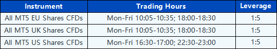 During these specific trading hours, MT5 Shares CFDs products leverage is fixed at 1:5 and additional margin is required to open any new positions. Once new holding positions are no longer within the specified trading hours, the leverage will automatically restore to 1:20.